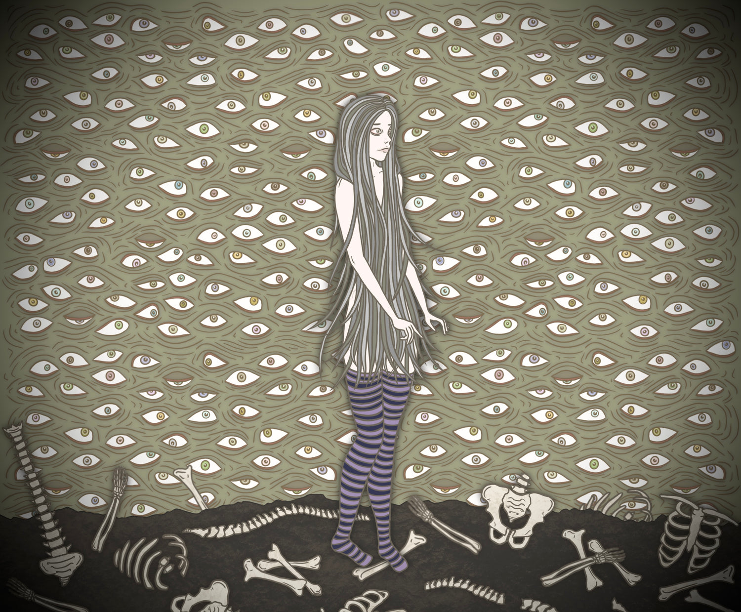 In the crypt’s shadows, secrets linger beneath stone and scripture; candle smoke curls against cold walls and footsteps echo like hymns half-remembered. Watchful eyes glimmer in the dark, scattered like omens — seeing, remembering, refusing to close. And in the dimmest corner lie the crumbling bandages of a mummy long walked away, a lone patch of oozing purple flesh, and a silver necklace once a symbol of protection, now laying rusted and blood stained in the cracks of the floor; together weaving a liturgy of the strange and the spectral.